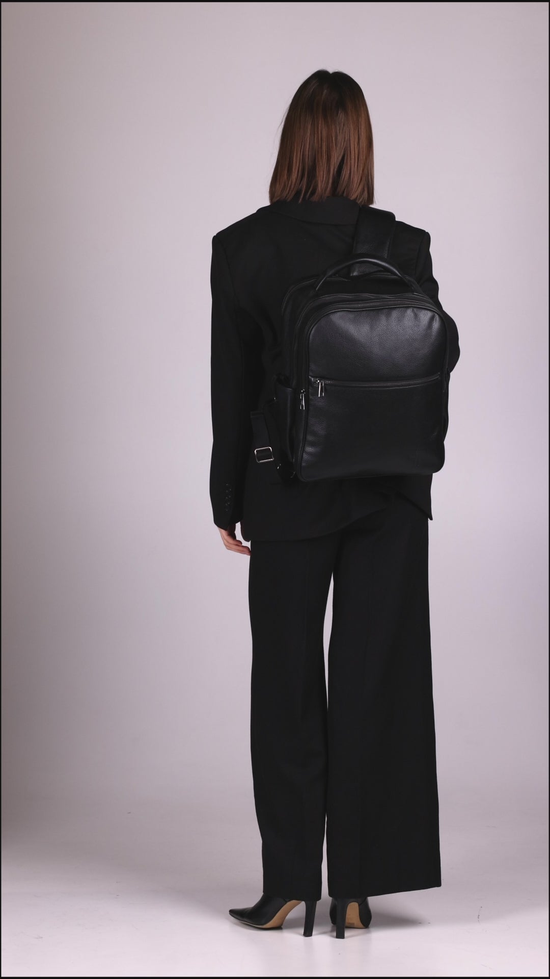 Gli spallacci apribili con zip, le cuciture tono su tono e il manico in pelle con rivestimento tubolare esprimono un’eleganza discreta e senza tempo.